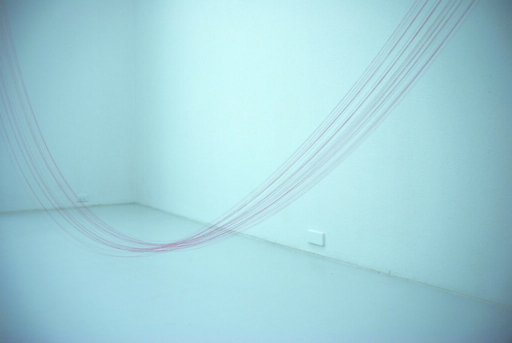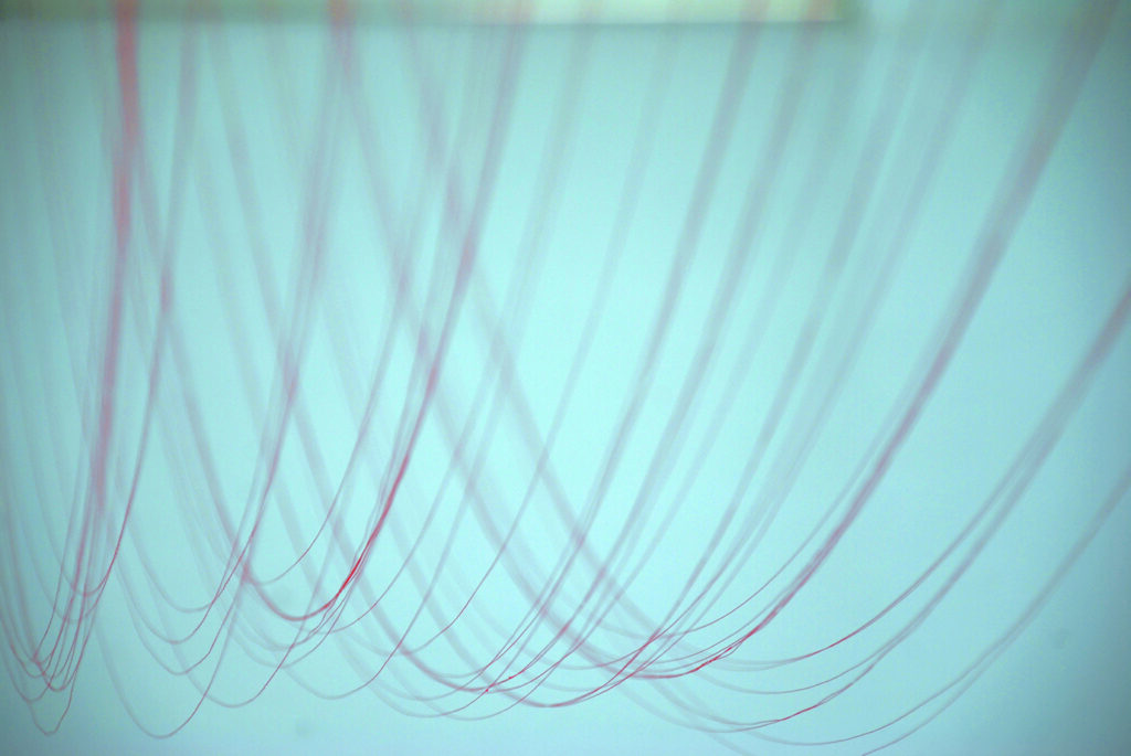 人の気配を感じ取って糸は揺れ、湿気で伸縮する。空気が静まるにしたがって糸は自重で垂曲線を描くが、絡まってしまうものもあるだろう。