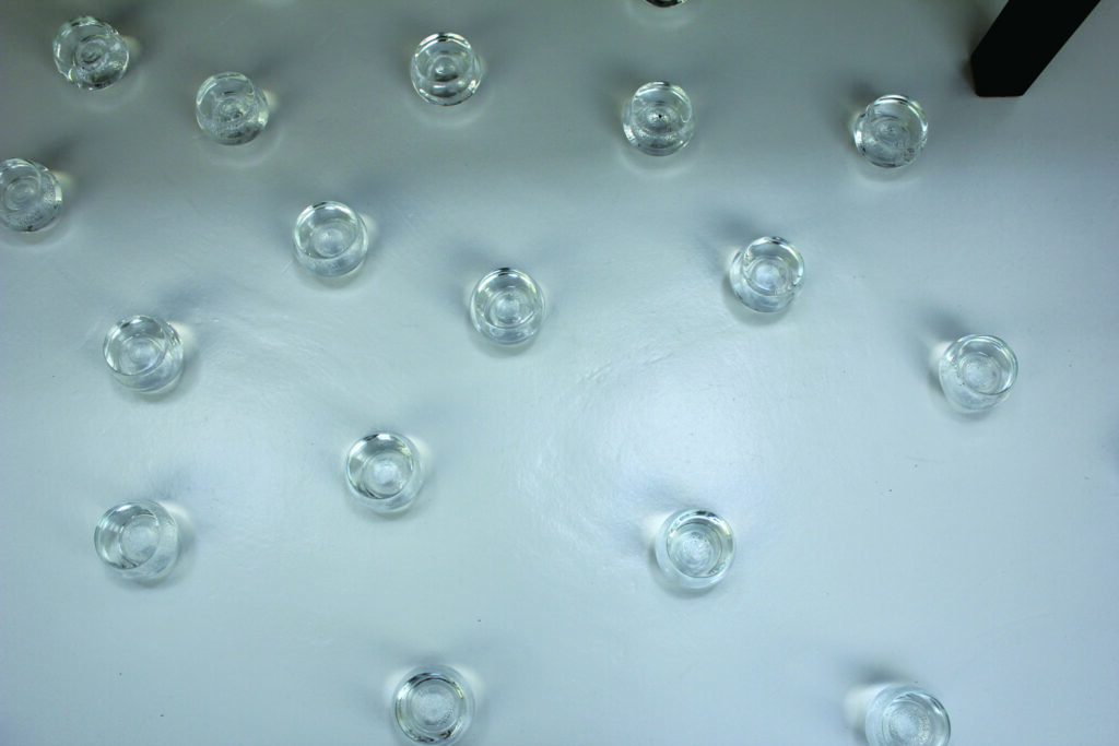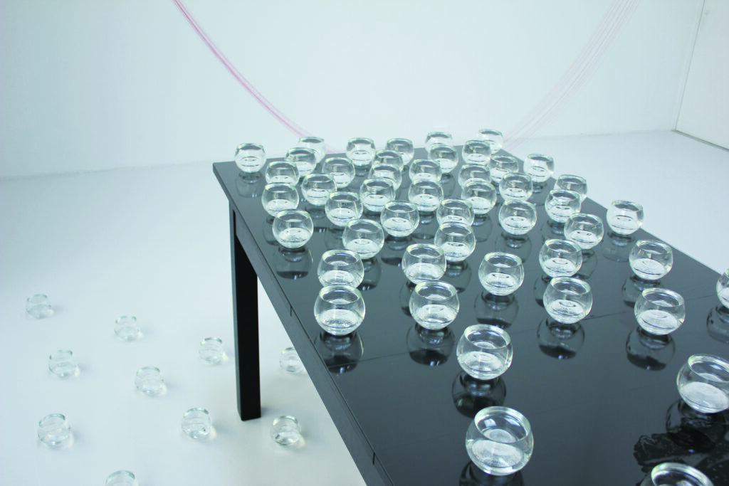 わたしが足をつけるこの場所は常に変化し安定していない。ガラスのうつわに満たされた水は留まらずに蒸発を続け、肌や髪や呼吸に僅かながら影響を及ぼすだろう。ガラスに映し出された風景も刻々と変化し、うつわひとつひとつ微細に違う風景を映す。どのようなときも変化し続け、小雨のように誰の肩をも等しく濡らし、足元に降り注ぎからだを揺らす。